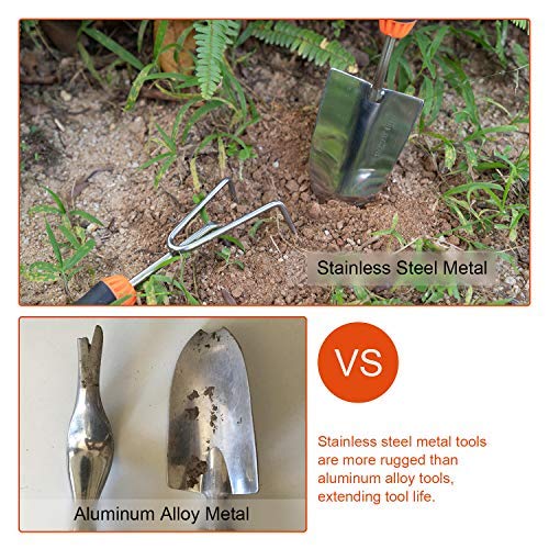 • RUST RESISTANT WITH STAINLESS STEEL – These 8 Stainless Steel gardening tools are with a soft-rubber, no-slip grip handle. The ergonomic design meets the highest standards. A hole at the top of each handle for storage. Sharp blade and tip are made Of solid Stainless Steel, which is rust-proof and extremely sturdy.