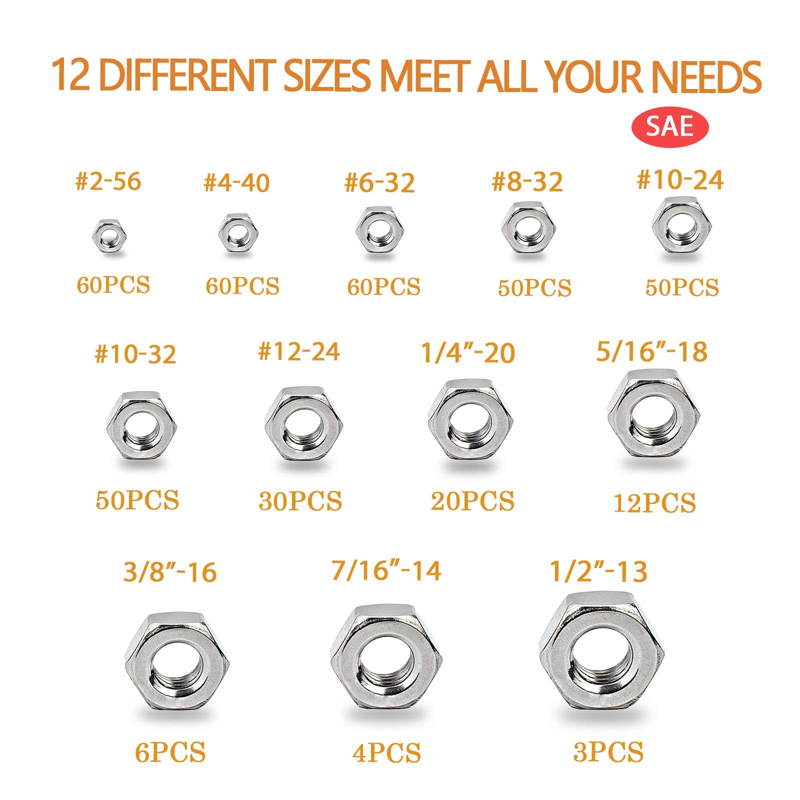 • Size Quanlity】 Assorted sae standard nut Kit contain the following 12 differen sizes:2-56 (60pcs) #4-40 (60pcs) #6-32 (60pcs) #8-32 (50pcs) #10-24 (50pcs) #10-32 (50pcs) #12-24 (30pcs) 1/4 inch-20 (20pcs) 5/16 inch-18 (12pcs) 3/8 inch-16 (6pcs) 7/16 inch-14 (4pcs)1/2 inch-13 (3pcs).