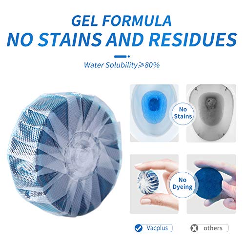 - LONG-LASTING EFFECT: With the sustained-release technology, each Vacplus splash toilet cleaner can continuously clean the toilet for up to 15 days with 20 flushes a day. With 6 packs for replacement, Vacplus toilet cleaner tablets can keep the toilet bowl clean and fresh for over 3 months.